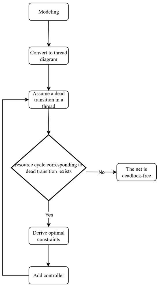 To avoid deadlocks, we apply discrete control theory to system modeling and control. Due to their strong expressive power, Petri nets are widely used in modeling automated manufacturing systems [3,4,5], multithreaded software systems [6], and similar applications [7,8,9,10,11]. However, the analysis and control problems of general Petri nets are highly challenging—sometimes even undecidable in certain scenarios. As a result, most prior research has focused on controllable subclasses of Petri nets [12,13,14,15,16,17,18].