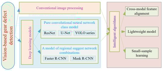 This paper is structured as outlined in Figure 2. We begin by highlighting the limitations of traditional gear defect detection methods, leading into Section 2, which focuses on “Gear Defect Detection Based on Traditional Image Processing.” Next, we transition to Section 3, “Gear Defect Detection Based on Deep Learning Models,” in light of the challenges faced by conventional image processing techniques. Then, in response to the bottlenecks and difficulties encountered by these two detection algorithms, we introduce Section 4, “Intelligent Algorithms to Addressing Challenges in Vision Algorithms.” Finally, we summarize the preceding content and present four forward-looking outlooks for future research directions.