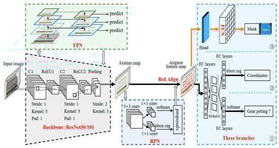 Mask R-CNN, a benchmark two-stage instance segmentation framework, offers unique advantages for the fine detection of gear surface defects. It innovates by decoupling instance segmentation into combined optimization for object detection and pixel-level mask prediction, outputting defect categories, locations, and geometric contours via a parallel branch architecture [85]. Unlike traditional semantic segmentation methods, its use of the RoIAlign layer instead of the RoI Pooling layer effectively eliminates spatial quantization errors in feature maps (reducing the error by more than 50%) [86]. This allows it to precisely capture sub-pixel edge features of gear surface defects like pitting and wear. Compared with Faster R-CNN, Mask R-CNN adds a mask prediction branch on the basis of the existing classification and bounding box regression branches. This mask branch uses a fully convolutional network (FCN) to generate a binary mask for each region proposal, which can accurately segment the defect area at the pixel level. Therefore, Mask R-CNN can not only detect the position and category of gear defects but also obtain the detailed shape and size information of defects, which is more conducive to the quantitative analysis of gear defects.