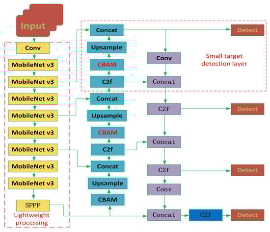 Shen et al. [105] proposed an improved YOLOv5s network model (VSD-YOLOv5s) based on the ShuffleNetV2 backbone. By replacing the C3 backbone with ShuffleNetV2, the size of the model is reduced by 45.5% and the FPS is reduced by 4 fps. The Squeeze–and–Excitation (SE) attention mechanism is introduced to adaptively adjust the weight of each channel feature, enhancing the model’s attention to defect features. The Non-Maximum Suppression (NMS) is upgraded to Distance IoU NMS (DIOU-NMS). Compared with traditional NMS, DIOU-NMS not only considers the overlap area between bounding boxes but also considers the distance between the centers of the bounding boxes and the aspect ratio of the bounding boxes. This can effectively solve the problem of missing detection when bounding boxes overlap and improve the detection accuracy by 1.7%. According to the relevant specifications in GB/T 42980 [108] “Performance Evaluation Methods for Machine Vision Systems,” the proposed method not only meets the stringent requirements for speed (FPS > 50) and accuracy (mAP > 95%) in the online detection of surface defects on injection-molded gears in terms of recognition accuracy, precision, and detection speed, but also provides stable and reliable technical support for efficient quality inspection in production lines. Yan et al. [106] introduced the lightweight STMS-YOLOv5 algorithm, which uses ShuffleNetv2 as the backbone to reduce computational load and parameters(parameters reduced by 44.4%, FLOPs reduced by 50.3%). The STMS-YOLOv5 algorithm also introduces a spatial-temporal multi-scale feature fusion module to enhance the fusion of multi-scale defect features and uses a lightweight attention mechanism to improve the model’s ability to detect small defects. Experiments on gear surface defect datasets showed that STMS-YOLOv5 maintains high detection accuracy (mAP 97.8%) with faster speed (FPS 16.3) and lower resource requirements (memory usage < 1GB), offering an efficient and lightweight solution for industrial gear defect detection with significant practical value and potential for widespread use in production lines. Wang et al. [107] addressed the low detection accuracy of YOLOv8s for small gear tooth defects by proposing several effective model optimizations. They incorporated the Convolutional Block Attention Module (CBAM) to focus on defect features and ignore irrelevant information, added a dedicated small-object detection layer to retain critical defect information lost during downsampling, and replaced the YOLOv8s backbone with MobileNetV3 (see Figure 6 for the optimized architecture) to reduce parameters (reduced by 40.2%) and computations (reduced by 45.3%). These measures enabled the improved model to excel in small defect detection (detection accuracy of small defects improved by 13.5%), providing a more precise solution for gear tooth surface defect inspection.