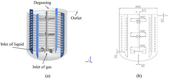 The schematic diagram of the flow system is depicted in Figure 1. The reactor is a standard elliptical-bottom stirred tank with an internal diameter of 480 mm. Four standard baffles are installed within the reactor, oriented at a 45° angle relative to the direction of the material outlet. A coil with an outer diameter of 15 mm is positioned inside the reactor. The impeller assembly consists of three stages: the upper two stages are pitched-blade turbines (PBT), while the bottom is a standard Rushton turbine (RT). The diameter of each impeller is 192 mm, with a spacing of 190 mm between two adjacent impellers. The impellers are driven by a shaft with a diameter of 25 mm. Liquid material feed enters the reactor horizontally through a 10 mm diameter pipe, whereas the gaseous material feed is introduced axially through a 10 mm diameter pipe from the bottom of the reactor. The reactor is equipped with a degassing port at the top, which permits only the gas phase to escape. The liquid product is withdrawn through an outlet on the side of the reactor head, with an outlet pipe diameter of 10 mm.