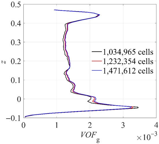 A grid independence study was systematically conducted to ensure result reliability. As shown in Figure 3, the gas volume fraction distribution along a vertical line in the reactor exhibits negligible differences once the mesh size exceeds 1.23 million cells. Therefore, to achieve an optimal balance between computational cost and numerical accuracy, all subsequent simulations were carried out using the grid model with approximately 1.23 million elements.