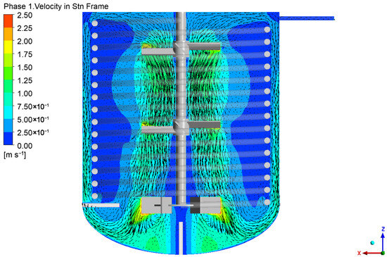As shown in Figure 4, the multiple impellers generate an axial circulation flow pattern from top to the bottom of the reactor, with the flow field being axially symmetrical on both sides of the shaft. Additionally, the presence of the coil in the reactor can significantly influence the fluid dynamics. The coil guides the fluid, promoting an overall axial circulation within the reactor. This flow configuration is highly beneficial for achieving a rapid mixing of materials within the reactor.