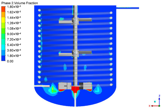 Figure 5 illustrates the distribution of gas holdup within the reactor. The overall gas holdup in the reactor is relatively low due to the small amount of gaseous catalyst BF3 required for the PAO polymerization reaction. In terms of distribution, the gaseous components are imported through the gas inlet, drawn in by the bottom impeller, and then discharged radially. After the quick dispersion, the catalyst is involved in the gas–liquid mass transfer process. Some of the gases are confined near the bottom of the reactor by the lower circulation, where they can further dissolve. This type of flow field is conducive to the efficient utilization of the gaseous catalyst BF3.