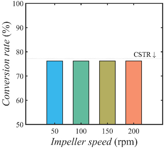 Figure 6 illustrates the simulated conversion of 1-decene in the reactor at various impeller speeds based on a finite-rate chemical kinetics model. The results indicate that when the speed ranges from 50 rpm to 200 rpm, the conversion of 1-decene closely aligns with the theoretical conversion for a continuous stirred tank reactor (CSTR), as represented by the black dashed line. This consistency confirms the accuracy of the previously mentioned theoretical analysis.