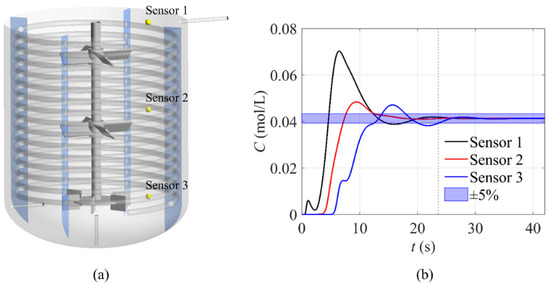 (a) Mixing time monitoring sensor locations and (b) instantaneous concentration at sensors under N = 50 rpm, τ = 4.2 h, and T = 30 °C.