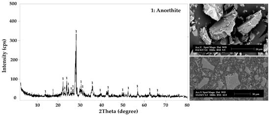 XRD analysis shows that the main phase formed is anorthite (Figure 2). The anorthite phase is corroborated with the revision of the COD N°CIF: 9000361. In addition, Choi et al. [37] characterized a clay in its natural state, obtaining the anorthite phase whose main peak was shown between 25° and 30°, as seen in this research. The characteristic crystals of anorthite appear in a columnar or acicular shape [38] as seen in Figure 2.