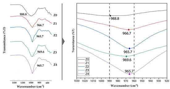 Zeolites exhibited a sharp peak around 970 cm−1. As shown in Figure 3, all samples display an asymmetric stretching due to the Si–O–T bond observed between the band of 960 and 990 cm−1, where T=Si or Al [39,40,41]. Zeolites Z2 and Z4 exhibit a slight shift in this band toward lower wavenumbers (965.7 cm−1), which is associated with a higher relative incorporation of Al atoms into the framework and, consequently, with a slightly lower Si/Al ratio, in accordance with the correlation reported by Ma et al. [40]. The presence of intense and sharp peaks involves Al-OH nests formed by cation vacancies [39,42]. Likewise, Yik-Ken Ma et al. [40] determined a linear correlation between the peak shifts and the Si:Al ratio in 19 zeolite types of known composition, up to a ratio of 5. This is because a greater amount of Al atoms tends to deform the band. In addition, they determined that the shift in this band is influenced by the vibration, length and angle of the Si-O-T bond that affects the chemical environment surrounding the silicon atoms. Although Z2 and Z4 exhibit similar FTIR peaks, they differ in thermal stability; the slight shift to the right of the FTIR T–O stretching band at ≈965 cm−1 in Z2 and Z4 suggests greater incorporation of Al into the structure and a slightly lower Si/Al ratio compared to Z1 and Z3. However, thermal stability depends not only on the Si/Al ratio, but also on the distribution of cations outside the framework and the density of structural defects generated during synthesis. Although Z2 and Z4 exhibit comparable FTIR bands, in the case of Z4 synthesized under more severe alkaline conditions (3 M NaOH, 150 °C) it is likely that the strongly basic medium promoted the preferential extraction of Si (desilication) and a partial redistribution of Al, leading to both Al-enriched regions within the framework and extra-framework Al species. This combined phenomenon explains both the shift observed in the FTIR spectrum (indicating a lower apparent Si/Al ratio) and the reduced thermal stability of Z4, as the presence of Al and structural defects decreases crystallinity and promotes dehydroxylation at lower temperatures [43].