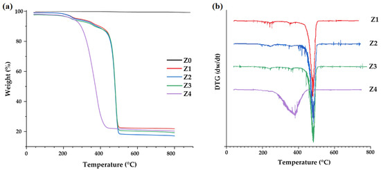 Figure 4 shows the thermogravimetric analysis (TGA) curves of volcanic ash (Z0) and the synthesized zeolites (Z1–Z4). Figure 4a depicts the differences in mass loss among the zeolites, which were generally similar, with final total mass losses of approximately 80%. In contrast, volcanic ash (Z0) exhibited negligible mass loss (~1%) up to 800 °C, indicating its high thermal stability and low volatile content. The thermal stability of zeolites is usually directly proportional to the Si/Al ratio [44]. Among the synthesized zeolites, Z4 displayed the lowest thermal stability, with significant mass loss starting at ~250 °C, whereas Z1–Z3 maintained structural integrity until approximately 450 °C. This trend suggests that Z4 has a lower Si/Al ratio, which was corroborated by FTIR analysis. Understanding these thermal stability differences is important for defining the operational temperature ranges and potential applications of these materials.