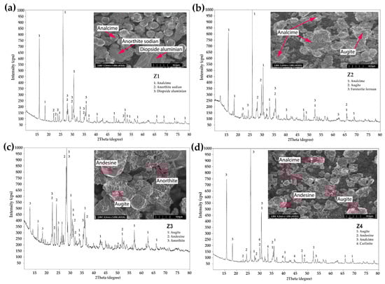 The mineral composition of the zeolites is shown in Table 4. The crystalline phases found in Z1 were analcime (H4.32Al1.806Na1.71O14.16Si4.194), sodian anorthite (Al1.55Ca0.55Na0.45O8Si2.45), and aluminan diopside (Al0.6Ca1Mg0.7O6Si1.7). For zeolite Z2, the phases were analcime, augite (Al0.1Ca0.86Fe0.25Mg0.83Mn0.01Na0.02O6), and ferroan forsterite (Fe0.2Mg1.8O4Si1). In both samples, the analcime was the dominant phase that is structurally stable and can be completely dehydrated [43]. Figure 6c,d show the diffractograms and SEM images of zeolites Z3 and Z4. The phases identified in Z3 were augite, andesine (Al1.488Ca0.491Na0.499O8Si2.506), and anorthite (Al2Ca0.94Na0.06O8Si2). For Z4, the phases included augite, andesine, analcime, and carlinite (STI2). The predominant phases were augite and andesine in Z3, and augite and analcime in Z4. Among all the zeolites, Z2 exhibited the highest analcime content.