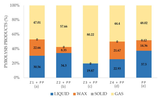 Percentage of products obtained from catalytic pyrolysis of PP: (a) Z1 + PP, (b) Z2 + PP, (c) Z3 + PP, (d) Z4 + PP and (e) thermal pyrolysis of PP.