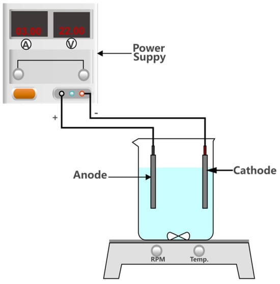 EO experiments were carried out in a batch reactor with a total working volume of 500 mL (Figure 1). A BDD electrode was used as the anode, while the cathode material varied depending on the experimental run and consisted of BDD, Cu, or Ti. The electrodes were positioned 1 cm apart, each with a geometric surface area of 16 cm2. Uniform mixing was maintained with a magnetic stirrer operating at 400 rpm.