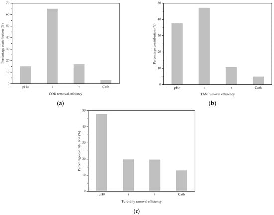 Percentage contribution of each factor in the removal of (a) COD, (b) TAN, and (c) Turbidity.