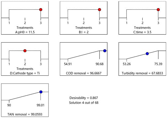 The numerical optimization results are shown in Figure 3. It shows that the maximum efficiencies for removing COD, TAN, and Turbidity are 96.57%, 99.06%, and 67.68%, respectively, achieving a desirability score of 0.867. The optimal conditions for this process are a pH0 of 11.5, an applied current of 2 A, a treatment time of 3.5 h, and the use of a titanium cathode.
