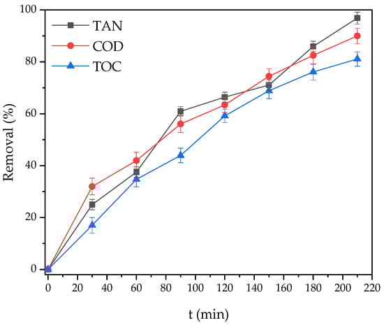 Removal efficiency decay for COD, TAN, and TOC under optimal operating reaction conditions. pH0 = 11.5, i = 2 A, t = 3.5 h, and Ti cathode.