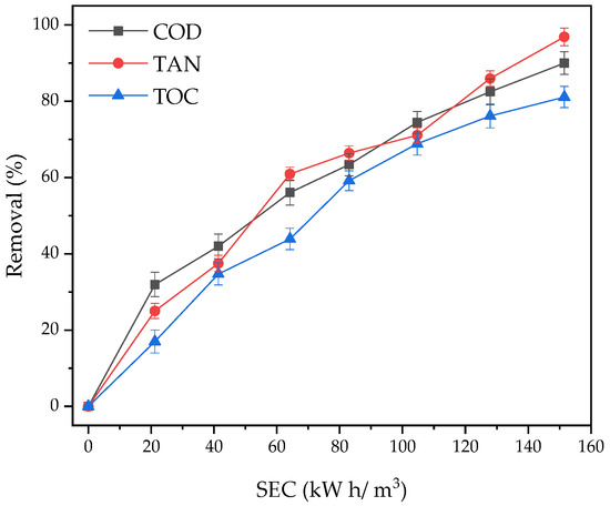 Specific energy consumption vs. COD, TAN, and TOC removal under optimal operating reaction conditions. pH0 = 11.5, i = 2 A, t = 3.5 h, and Ti cathode.