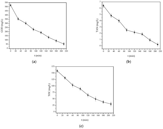 Removal profiles under optimal operating reaction conditions (a) COD, (b) TAN, and (c) TOC. pH0 = 11.5, i = 2 A, t = 3.5 h, and Ti cathode.