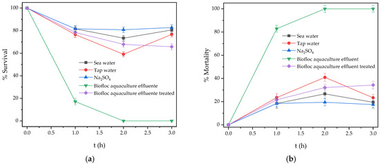 A series of five complementary experiments, each performed in triplicate, evaluated the toxicity of Artemia salina under different water sources and exposure times, with the averaged results presented in Figure 8. The findings reveal a pronounced difference between untreated and treated aquaculture effluent. The untreated effluent was completely lethal, with 0% survival and 100% mortality. In contrast, treatment markedly reduced toxicity, achieving a survival rate of 65.7% and a corresponding mortality rate of 34.3%.