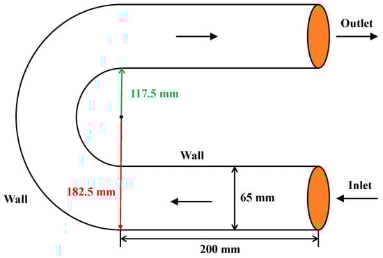 In the convection section of steam injection boilers, U-shaped bends function as key heat transfer components, designed to facilitate efficient thermal exchange between steam and flue gases within a compact configuration. The curved geometry not only enables flexible installation in space-constrained layouts but also enhances flow disturbance through centrifugal effects, thereby improving heat transfer performance and reducing ash accumulation. This study focuses on the U-tube in the convection section of a steam injection boiler at a Chinese oilfield. The tube has an inner diameter of 65 mm, inlet and outlet straight sections of 200 mm, and a bending radius of 150 mm. The geometric model of the U-tube is shown in Figure 1. The inlet steam dryness fraction was set to 0.75. To determine the inlet steam parameters of the U-tube, the horizontal pipe upstream of the convection section was first simulated, and its outlet steam parameters were adopted as the U-tube inlet conditions. The inlet steam parameters at the convection section were 626.402 K and 17.2 MPa.