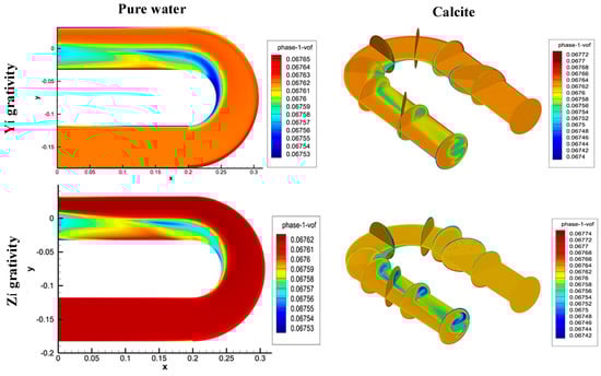 When gravity is applied along the Y-axis, the U-tube is oriented vertically. For pure water, the liquid phase exhibits distinct stratification along the gravitational direction, with a maximum volume fraction of 0.06765 and a minimum of 0.06753. At the straight inlet section, the lower semicircular cross-section shows a higher boundary volume fraction, indicating stratified flow induced by gravity, whereas the upper semicircular cross-section shows a lower boundary volume fraction, where boiling promotes the conversion of water into steam. As the flow passes through the elbow, the stratification tendency is disrupted. A small low-volume-fraction region develops along the inner bend, with a steep gradient in volume fraction, and the overall flow transitions toward annular flow. In the outlet straight section, stratification tends to reappear. Within the two dominant vortices at the outlet, located symmetrically on the left and right sides, the water volume fraction distributions are nearly identical.