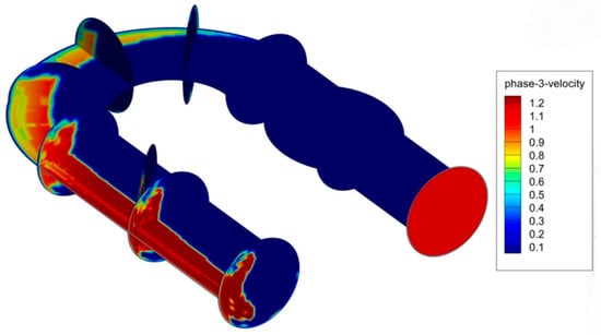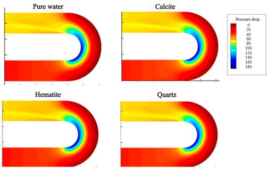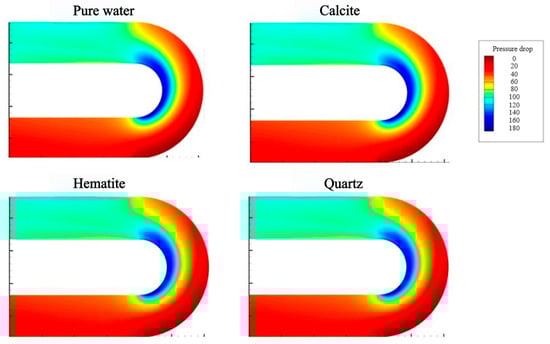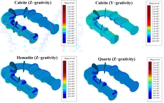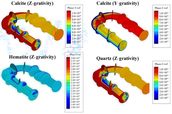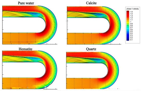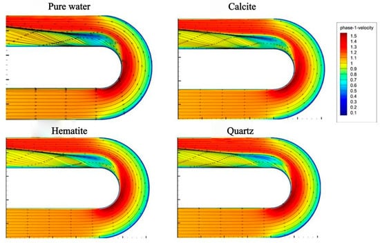 The velocity distribution and streamlines of pure water and various salts under Z-axis gravity within a U-shaped cross-section are shown in Figure 6. The maximum velocity of the primary phase is 1.5 m s−1, with a minimum of 0.1 m s−1. A velocity boundary layer is clearly observed in the diagram. Starting from the mid-section of the bend, the direction of streamlines near the inner tube wall begins to change, with the flow moving progressively away from the wall until the streamlines approach and cross the central axis of the horizontal outlet pipe. For flows containing quartz, hematite, and calcium carbonate, a low-velocity region is present on the inner side at the junction between the bend and the straight outlet pipe, with nearly identical velocity distributions. Due to mesh quality effects, a numerical step discontinuity is observed in the velocity boundary layer at the junction between the outer bend and the horizontal pipe.
