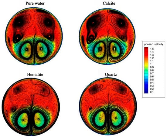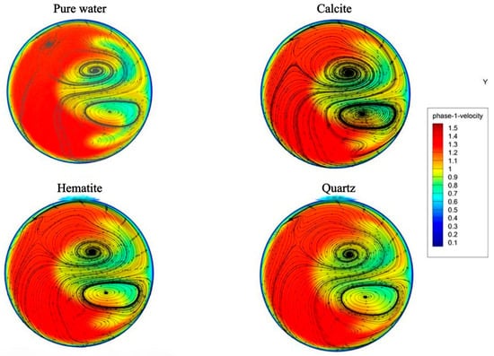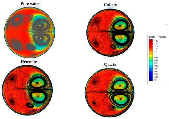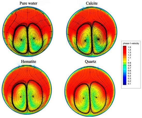 Figure 11 presents the velocity contour and streamlines of the liquid water phase at the outlet for pure water and high-dryness steam carrying calcium carbonate, hematite, and quartz under Y-axis gravity. The sizes of the vortices on the left and right sides exhibit some asymmetry. Theoretically, under Y-axis gravity, the vortices on both sides should be of equal size. However, due to the use of a sampling algorithm in the streamline calculations, there are random variations in vortex size. After several iterations, the streamline diagram shown here was obtained, featuring relatively sparse local streamlines and vortices of approximately equal size.