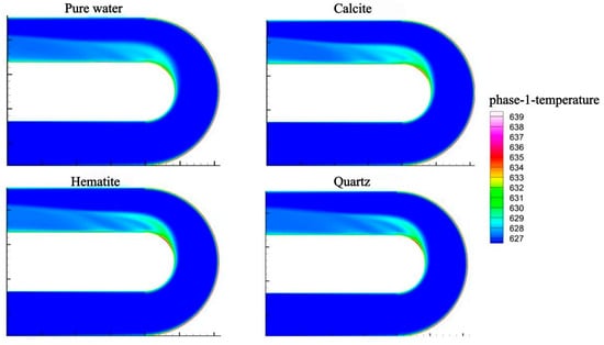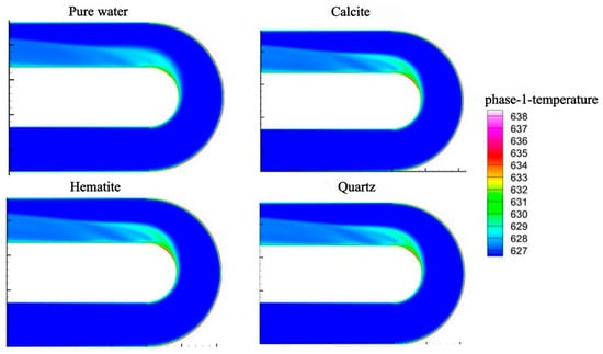 The temperature distribution across the U-shaped cross-section for pure water and various salts subjected to gravitational force along the Y-axis is shown in Figure 14. The maximum temperature reaches 639 K, while the minimum is 627 K. The temperature distribution under Y-axis gravity is essentially identical to that under Z-axis gravity. Furthermore, when subjected to Y-axis gravity, the temperature field distribution of flows carrying quartz, hematite, and calcium carbonate closely matches that of pure water. The higher maximum temperature compared to the Z-axis gravitational field indicates that fluid heating is more pronounced under Y-axis gravity, coupled with relatively greater flow resistance.