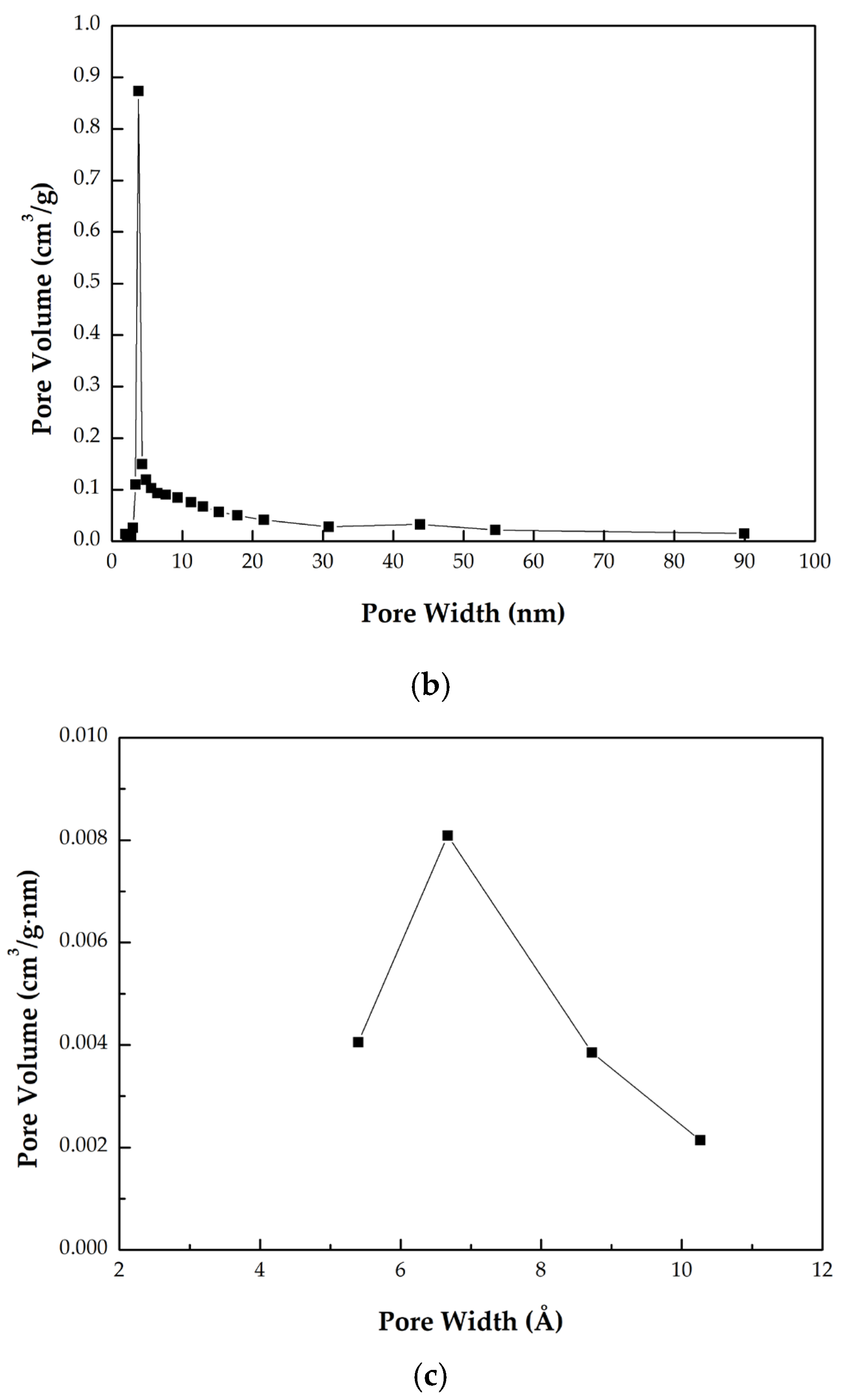 - The pore size distributions derived from the BJH and HK methods are presented in Figure 4 and Figure 5, respectively. As shown in Figure 4, a pronounced peak was observed at approximately 3.8 nm, indicating the presence of mesopores within the 2–50 nm range in the optimal biochar [28]. Additionally, significant microporosity within the 0.6–0.8 nm range was observed in Figure 5, consistent with the values reported in Table 2 and the isotherm profile in Figure 3.