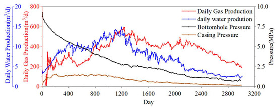 Currently, the area comprises 172 wells, primarily exploiting the 5# and 8# coal seams in combination. When mining the 5# seam alone, daily water production is generally low (average 1.32 m3), with maximum daily gas production ranging from 300 to 1800 m3. When mining the 8# seam alone, daily water production ranges from 2 to 24 m3, and daily gas production from 50 to 500 m3, with poor gas-production efficiency. When mining the 5# and 8# coal seams jointly, daily water production varies significantly (1.18~142 m3), with maximum daily gas production ranging from 0 to 2300 m3. Stable daily gas production is approximately 400~600 m3. Among them, the production curve of a typical well jointly mining the 5# and 8# coal seams is shown in Figure 1. Overall, the 5# coal seam is the primary gas-producing layer, while the 8# coal seam carries a higher risk of water production.