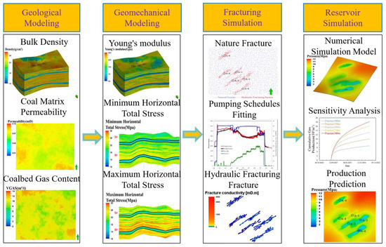 Building upon the concept above, this study proposes a technical roadmap for integrated numerical simulations of CBM (Figure 2). The process begins with 3D geological modeling, 3D in situ stress modeling, fracturing simulation, and, finally, coupled production simulation of the fractured network. Based on this foundation, simulation studies for development-parameter optimization can also be conducted. Currently, mature integrated platforms include Petrel, JewelSuite, Landmark, FrSmart, and Hifrac [38,39]. This paper employs Schlumberger’s Petrel software 2024 version, internally embedded with the UFM fracturing simulation module, to perform integrated simulation for CBM. All simulations are completed on a computer equipped with an Intel Xeon Platinum 8370C CPU (64 cores), 128 GB RAM, and an NVIDIA GeForce RTX 4080 GPU.