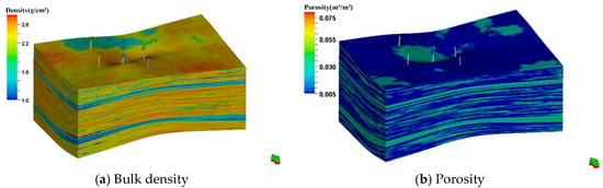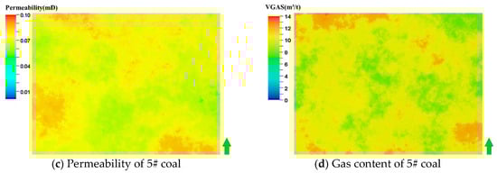 Based on stratigraphic data from nine wells in well group A, a 3D structural model was established encompassing the coal seam roof, floor, 5# coal seam, 8# coal seam, and intermediate layer. The roof thickness ranges from 1.4 to 6.1 m, 5# coal seam thickness from 5.7 to 8.1 m, 8# coal seam thickness from 7.3 to 10.1 m, and floor thickness from 2.1 to 5.7 m. Subsequently, a refined property model for well group A was developed using well-logging data and sequential Gaussian simulation. The coal seam bulk density ranged from 1.31 to 1.56 t/m3, porosity from 2.73 to 3.42%, matrix permeability from 0.0235 to 0.0499 mD, and gas content from 10.28 to 12.05 m3/t (Figure 3).