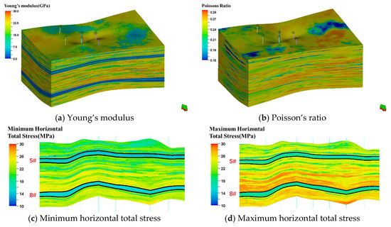 Based on well-logging data and the aforementioned geological model, a 3D geomechanical model was established using the Visage simulator, which is a finite element-based geomechanics simulator embedded in Petrel. Following geomechanical-grid discretization, rock-mechanical parameter modeling, pore-pressure calculation, and strain-boundary condition setup, a single Visage calculation takes approximately 40 min. To achieve a fit for 3D and 1D stress states, approximately five iterations of parameter adjustment and Visage calculations are typically required. The modeling results (Figure 4) indicate that coal seam 5# in well group A exhibits an average Young’s modulus of 5.36 GPa, an average Poisson’s ratio of 0.237, an average pore pressure of 11.48 MPa, an average overburden stress of 27.42 MPa, an average minimum horizontal principal stress of 17.91 MPa, and an average maximum horizontal stress of 18.89 MPa. Comparative analysis reveals that the coal seam’s Young’s modulus, Poisson’s ratio, and horizontal principal stress values are all lower than the corresponding roof and floor strata values (Table 2). The difference between the coal seam’s minimum horizontal principal stress value and that of the roof and floor strata ranges from 3.41 to 5.90 MPa (All green arrows in the following figures indicate the north direction).