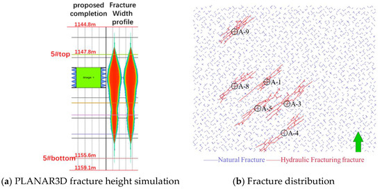 According to the fracture-monitoring data from the study area, large-scale natural fractures are poorly developed. However, field observations reveal the presence of joint structures within the coal seam. Therefore, two sets of orthogonal natural fractures were introduced to simulate the joint structure of the coal seam. Based on the preceding stress analysis, the stress difference between the coal seam and the overlying and underlying strata is significant, suggesting that fractures should be confined within the coal seam. To validate this concept, the precise fracture-height-mechanism model (PLANAR3D) was employed to simulate fracture height. Results indicate that the fracture height is slightly greater than the coal seam thickness (Figure 5a), confirming that the fractures are generally well constrained by the overlying and underlying strata. Subsequently, based on the actual fracturing-pump-injection data and perforation information, the fracturing simulations for six wells in 5# coal seam were completed using the UFM. Among them, the fracturing simulation for a single well took approximately 2 min. As shown in Figure 5b, the average hydraulic fracture lengths for the six wells ranged from 169.79 to 215.84 m, the average supported fracture lengths ranged from 142.11 to 200 m, with hydraulic fracture heights ranging from 8.91 to 10.45 m and supported fracture heights averaging between 2.81 and 5.80 m. The average fracture conductivity was between 121.92 and 248.71 mD·m. The hydraulic-fracture propagation patterns under current geological and engineering conditions for well group A were clarified through fracture simulation. Parameters such as the fracture geometry and fracture conductivity were obtained, providing an accurate fracture-network model and property parameters for subsequent production dynamic simulation.