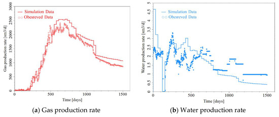 Based on the fracture network parameters and geological models, the production numerical simulation model for well group A of the 5# coal seam was established using the INTERSECT simulator (also embedded in Petrel) (Figure 6). Additionally, this model incorporates mechanisms specific to CBM, such as stress sensitivity, diffusion, and desorption. CBM simulation using INTERSECT can employ a traditional single-porosity medium model, where organic matter content is set as a grid property and adsorbed components are represented as solution variables. This implies that the same number of grid cells simultaneously possess dual definitions for both pore space and organic matter. By explicitly defining organic matter through new property values, this approach provides a clearer and more consistent mechanism for defining simulation cases. To define organic matter, two property parameters must be input: “Organic matter gross fraction” and “Organic matter porosity coupling.” The former represents the percentage of coal matrix within the overall grid and can be calculated based on the gas-content property described in Section 3.1 (Figure 7). The latter represents the coupling factor between organic matter and porous media, influencing gas diffusion. Additionally, the Langmuir isotherm adsorption model is employed to simulate coalbed-methane desorption. Based on laboratory experimental data, the Langmuir volume (VL) is set to 25.93 m3/t, the Langmuir pressure (PL) to 2.02 MPa, and the methane diffusion coefficient to 0.026 m2/d.