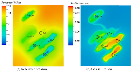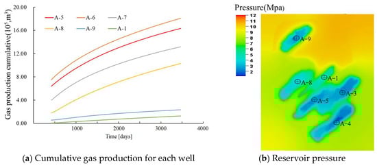 Based on the model fitted to production history, a further ten-year production forecast indicates a cumulative gas production for the well group of 616 × 104 m3, with a total recovery rate of 10.17% (Figure 10a). The simulated cumulative gas production for well A-6 was 181 × 104 m3, exhibiting an error of only 6.1% compared to TOPAZE’s forecast for A-6, indicating the established model’s high accuracy. As shown in Figure 10b, significant areas of under-utilized reservoirs remain between wells during the final prediction phase, with relatively high residual gas content. This indicates substantial potential for enhanced recovery operations in this area following the conclusion of conventional depletion development.