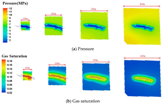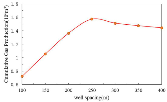 First, maintaining the fracture length of 231.88 m and the fracture conductivity of 250 mD·m for well A-7 constant, simulations were run for 15 years with well spacings ranging from 100 to 400 m. As illustrated in Figure 11, cumulative gas production initially increases then decreases with increasing well spacing, peaking at 250 m. This behavior stems primarily from the following factors: (1) greater pressure decline induces higher desorption of adsorbed gas. When well spacing is less than fracture length, expanding pressure-decline zones increase desorption coverage, boosting cumulative gas yield; and (2) when the well spacing exceeds the fracture length, further increases in spacing expand the supply range but paradoxically reduce the pressure drop. This diminishes the desorbed free-gas saturation near fractures, thereby decreasing gas production. Consequently, optimal desorption occurs when the well spacing is marginally greater than the fracture length, resulting in maximum cumulative gas production at 250 m spacing (Figure 12).