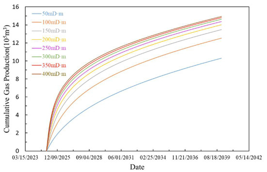 Maintaining the well A-7 fracture length at 231.88 m, production forecasts were conducted for 15 years with fracture conductivity ranging from 50 mD·m to 400 mD·m. As shown in Figure 13, cumulative gas production gradually increases with rising fracture conductivity, though the rate of increase progressively slows. Beyond a fracture conductivity of 200 mD·m, the growth in cumulative gas production diminishes significantly. This occurs because, at higher fracture conductivities, the matrix permeability becomes the primary factor limiting further increases in cumulative gas production. In other words, under the coalbed properties of the study area, it is recommended that the designed fracture conductivity does not exceed 200 mD·m.