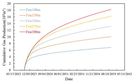 Maintaining the fracture conductivity of well A-7 at 250 mD·m, production forecasts were conducted for 15 years with fracture lengths ranging from 100 m to 300 m. As shown in Figure 14, cumulative gas production exhibited near-linear growth when fracture length increased from 100 m to 250 m. Further increases in fracture length yield markedly diminished incremental cumulative gas production. This indicates that, under the geological conditions of the study area, fracture lengths exceeding 250 m are not recommended.