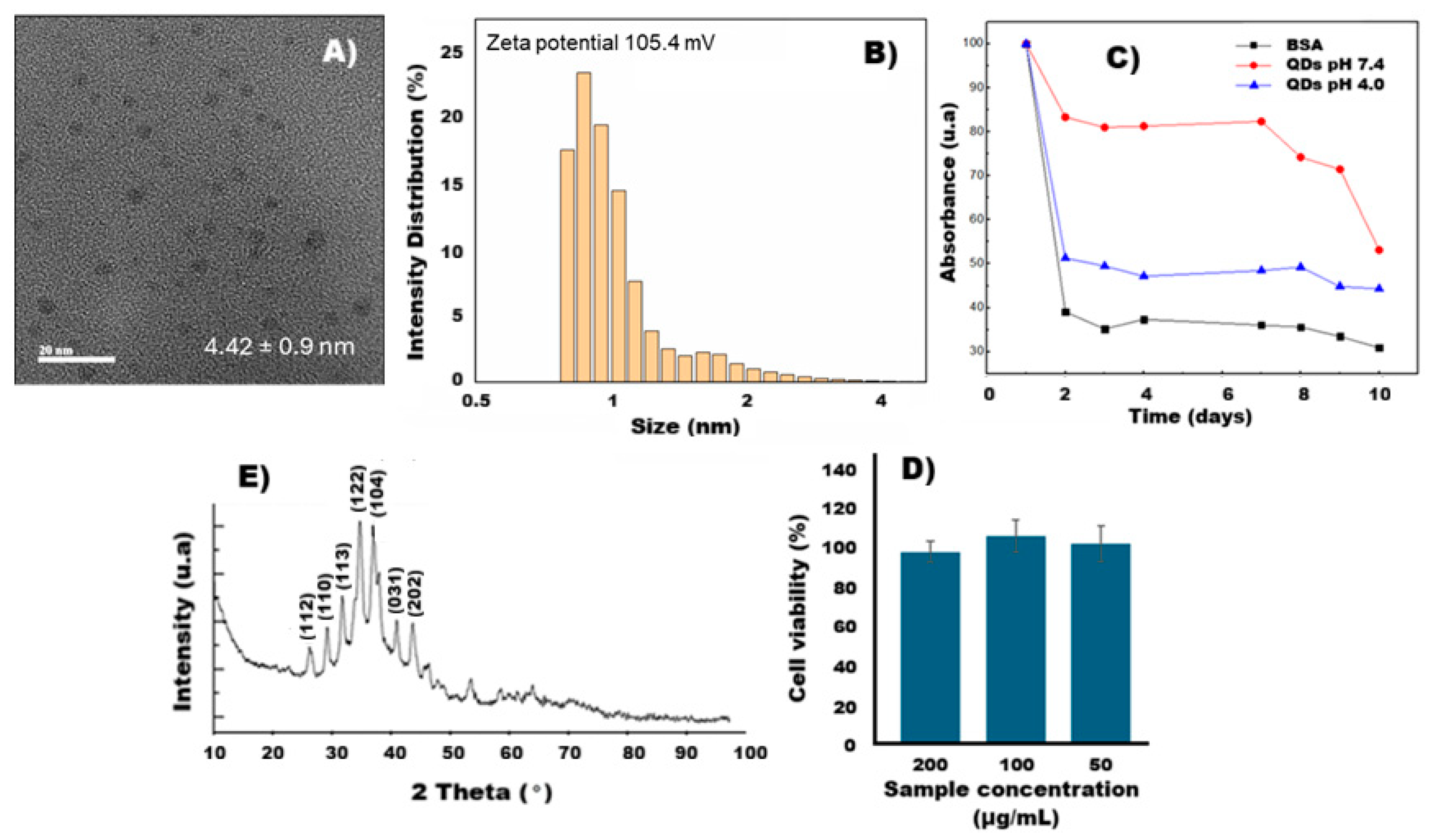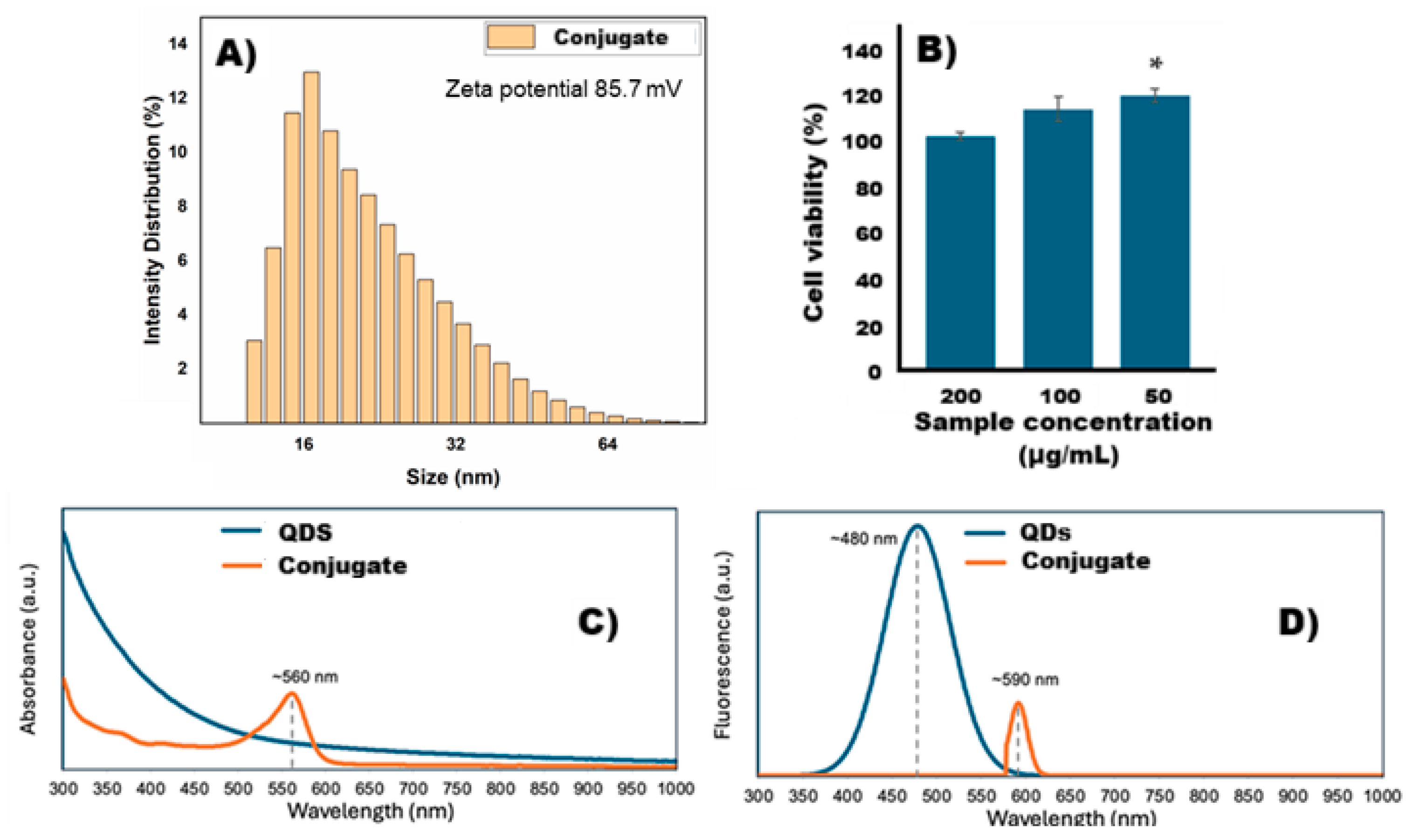 Finally, UV–Visible absorption spectra were recorded with a Varioskan™ LUX multimode microplate reader (Thermo Fisher Scientific, Waltham, MA, USA). The QDs were resuspended in distilled water and analyzed at room temperature across a wavelength range of 280 to 800 nm.