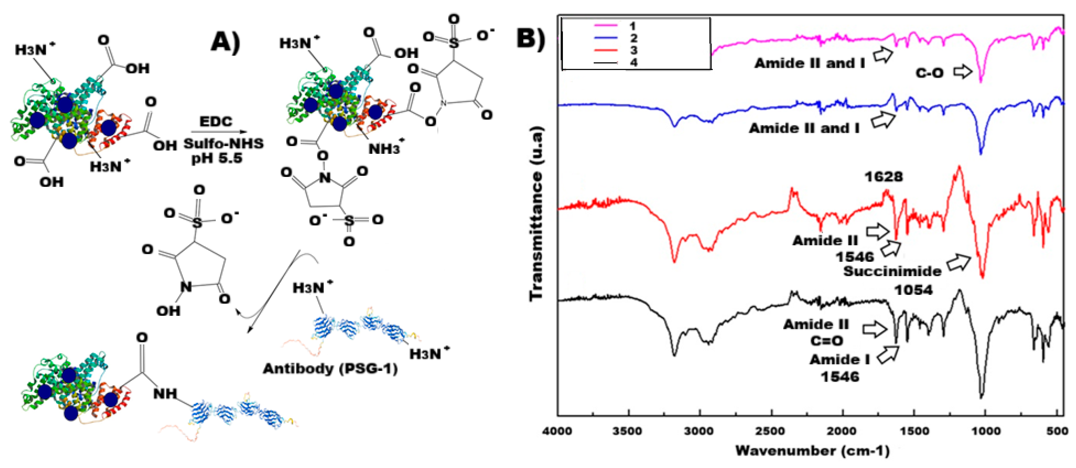 For the preparation of the conjugate, it was necessary to exchange the original aqueous medium (Milli-Q water) in which the Ag2S-BSA QDs (1 mg/mL) were dispersed with a 0.1 M MES buffer solution (pH 5.5). This exchange was performed by centrifugation at 3500× g for 10 min at 4 °C using an Amicon® ultrafiltration concentrator system (30 kDa), replacing the supernatant with fresh MES buffer at each cycle. The process was repeated three times, and the pH was adjusted to 5.5 using 1 M NaOH. Subsequently, 1.44 mg/mL of 1-ethyl-3-(3-dimethylaminopropyl) carbodiimide (EDC) was added directly to the solution and incubated for 2 min at room temperature with gentle agitation. EDC reacts with the carboxyl groups present on the BSA, forming an unstable acylisourea ester intermediate. Then, 3.25 mg/mL of N-hydroxysulfosuccinimide (Sulfo-NHS) was added to the mixture and incubated for 10 min in the dark at 400 rpm, allowing the formation of a stable NHS-ester intermediate, which enhances coupling efficiency with primary amines. To remove excess unreacted EDC and Sulfo-NHS, the mixture was centrifuged again at 3500× g for 10 min at 4 °C in the dark, using an Amicon® ultrafiltration concentrator system (30 kDa). The supernatant was replaced with PBS buffer (pH 7.4), and the process was repeated three times. After activation of the carboxyl groups, conjugation with the monoclonal anti-PSG1 antibody (this product is preservative-free, ThermoFisher Scientific, Monterrey, Mexico) was carried out by adding 5 µL of a 1 µg/µL antibody solution. The mixture was incubated for 2 h at room temperature under constant agitation (400 rpm) in the dark to facilitate the formation of covalent bonds between the antibody’s amine groups and the NHS-activated carboxyl groups on BSA. To minimize nonspecific cross-linking between BSA and other proteins, a blocking step with 1 M glycine was performed by incubating the mixture for 15 min in the dark. Finally, the mixture was centrifuged at 16,873× g for 10 min using the Amicon® ultrafiltration concentrator system (100 kDa) to remove unbound antibody, glycine, and residual cross-linking reagents. The final conjugate was stored at 4 °C in the dark until further use.
