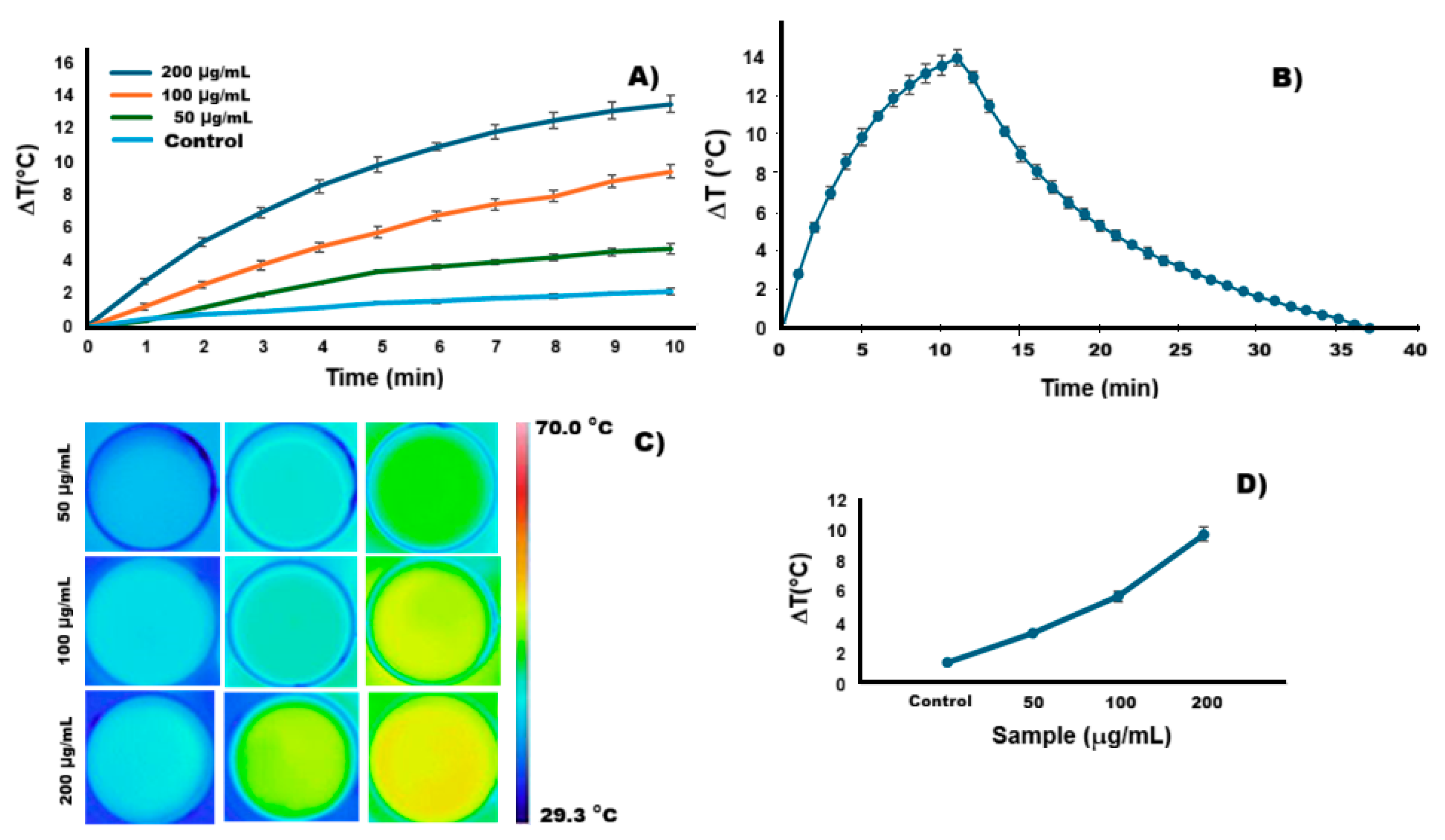 Figure 4D shows the thermal response of the conjugate after 5 min of irradiation, demonstrating a concentration-dependent temperature increase, reaching up to 46.9 °C at 200 µg/mL. This behavior confirms the photothermal efficiency of the nanoparticles.