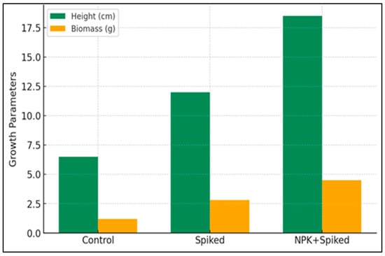 Qualitative morphological assessments provided a clear visual corroboration of the quantitative growth and biomass data, reinforcing the physiological impact of the different soil treatments. The observed phenotypes directly reflected the degree of metal stress and the efficacy of the applied amendments. The visual superiority of the plants in the NPK + Spiked treatment is a direct result of the synergistic effect of the combined amendments. This is clearly demonstrated in