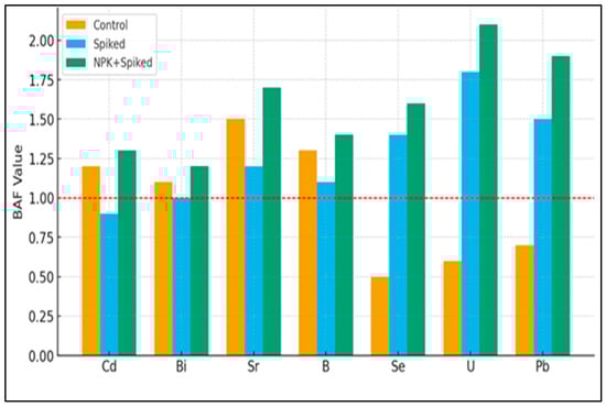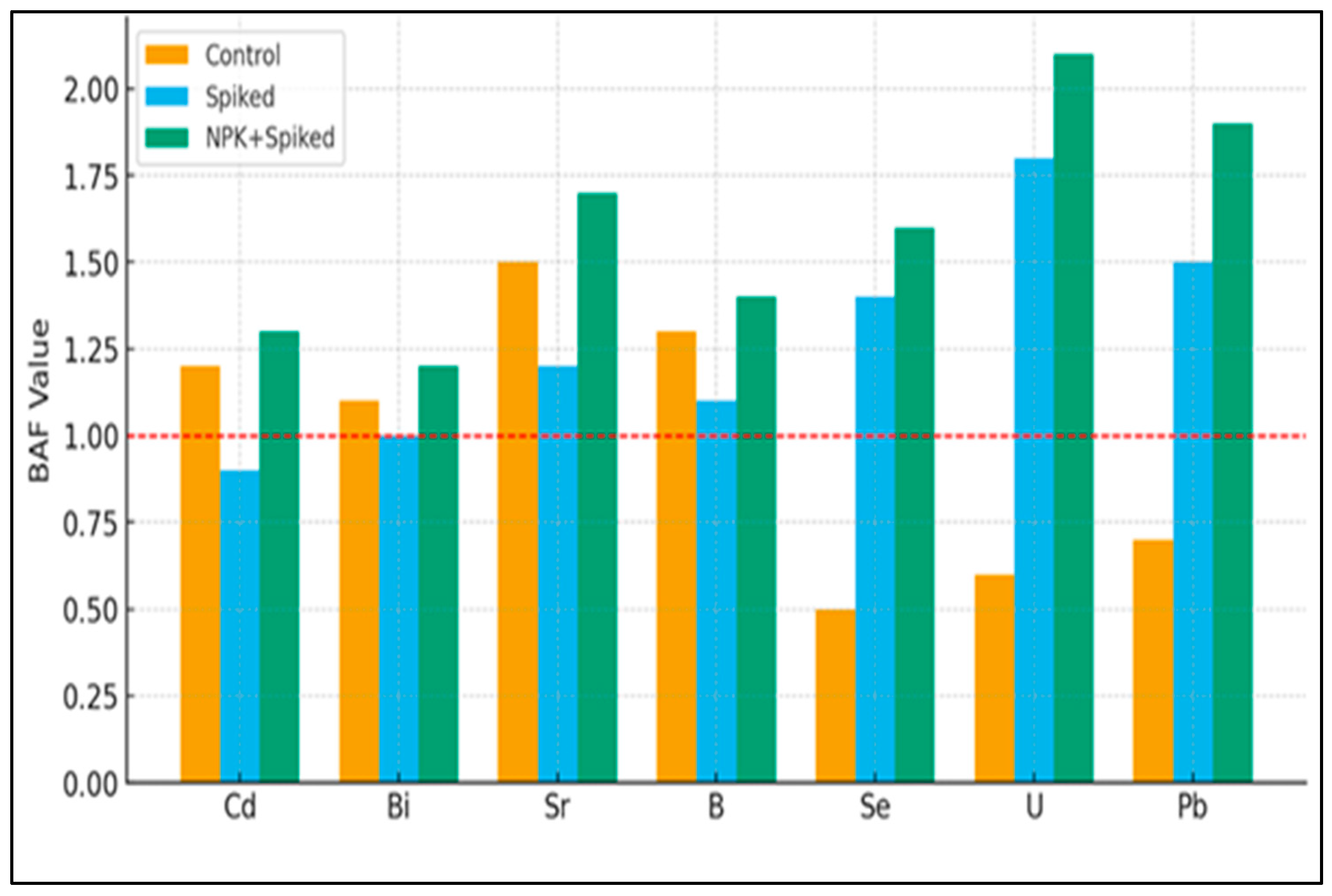 The Bioaccumulation Factor (BAF) was calculated to quantify the plant’s ability to accumulate metals from the soil [