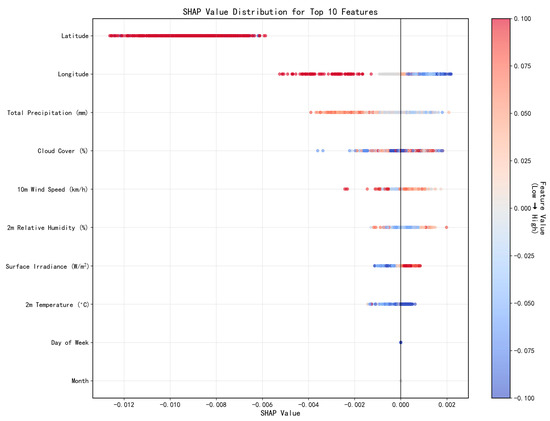 - Stability of Feature Attributions: The SHAP Value Distribution of the Top 10 Features (Figure 8) provides direct evidence for the stability of the attributions. The narrow distribution of SHAP values for the most important features (e.g., Month and Temperature) indicates that their estimated marginal contributions are consistent and reliable across the dataset. In contrast, features with wider distributions exhibit more context-dependent effects. This analysis confirms that the primary drivers identified by the model are not spurious.