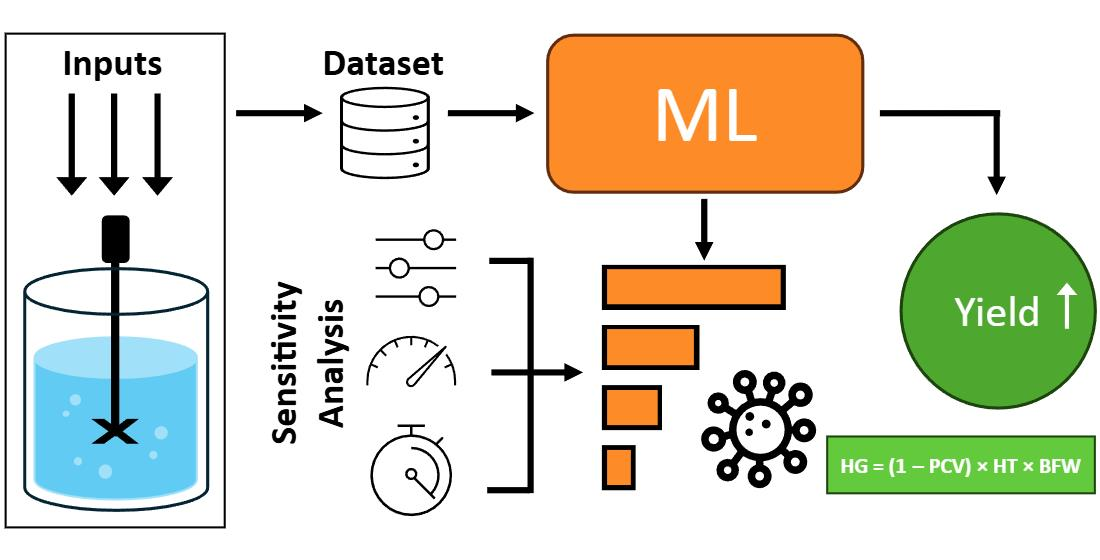 27], who highlighted the ability of ML models to uncover nonlinear parameter dependencies and guide operational stability in complex bioprocesses. In our study, because the exploratory framework relied primarily on BFW predictions, the resulting parameter recommendations represent aggregate yield behavior and may not fully capture HT- or PCV-specific effects.