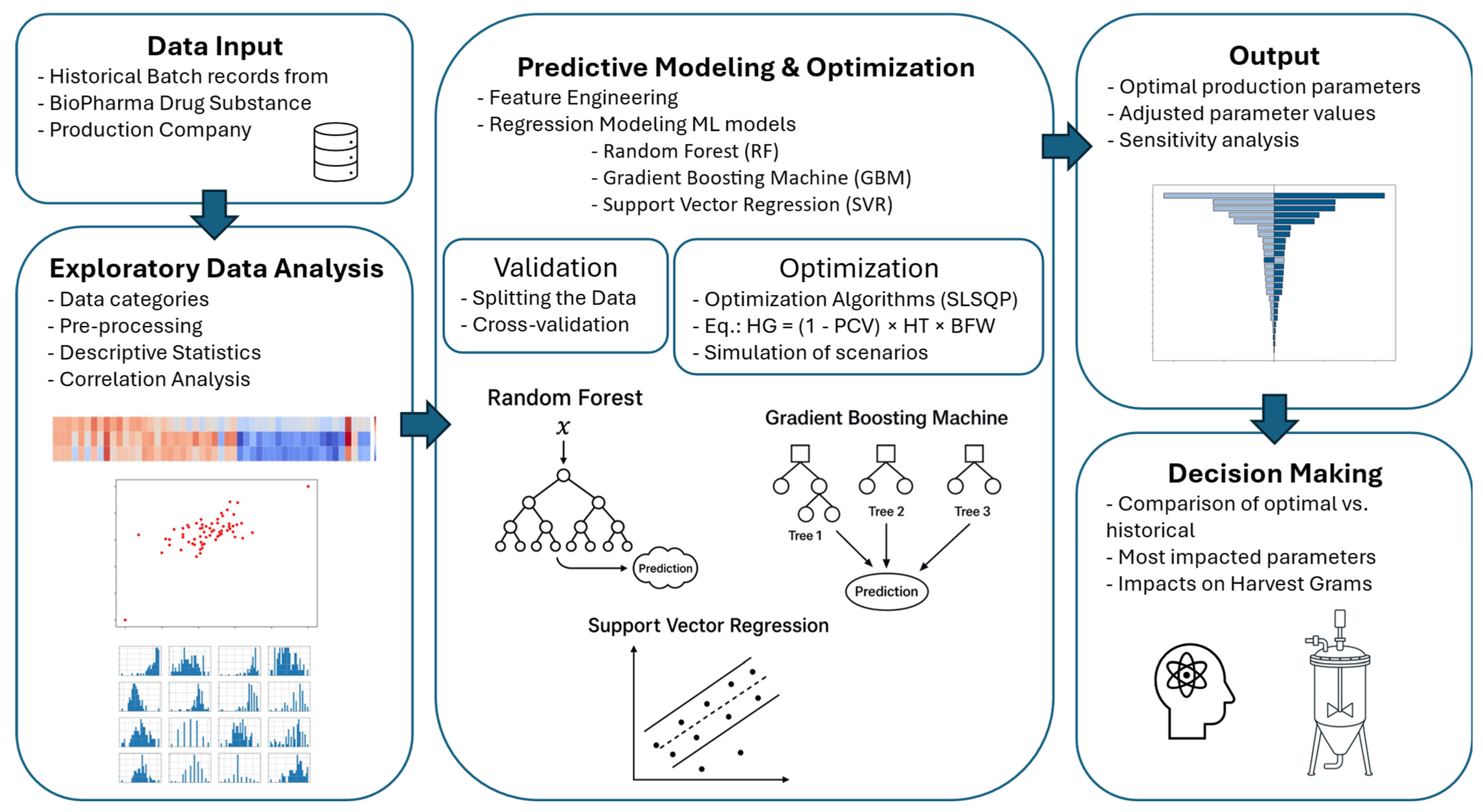 The dataset for this study was provided by a global CDMO specializing in large-scale mAb production. The objective was to leverage ML techniques to improve the upstream bioprocessing yield by analyzing historical batch records, identifying key process parameters, and applying predictive modeling and exploratory analysis strategies. This study adopted a statistical approach, leveraging ML models trained on historical batch data without relying on mechanistic or first-principles modeling. Its methodology encompassed several key steps, including data preprocessing, exploratory data analysis (EDA), ML model development, and process analysis. An overview of the methodology is provided in
