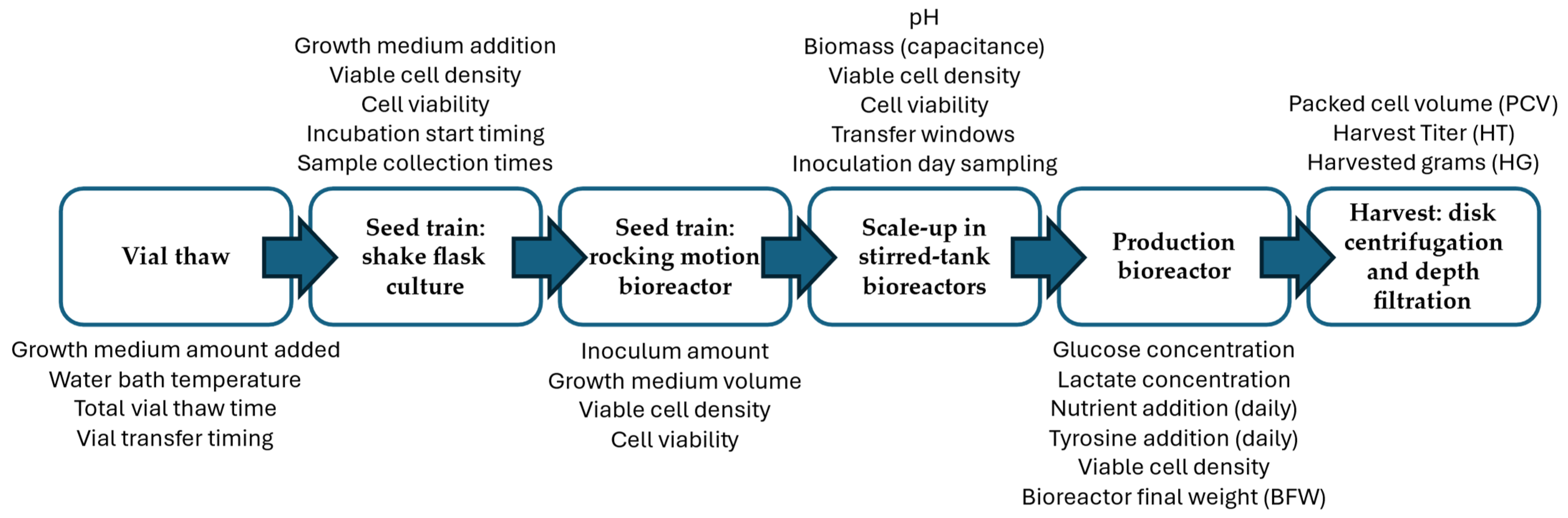 Several process parameters influencing the final harvested yield were analyzed in this study. These included transfer timing, which impacts cell adaptation and growth consistency during the transition between bioreactors; cell growth lag, quantified as the time interval between inoculation and the onset of exponential growth based on viable cell density data; the adjustment of nutrient additions, such as tyrosine and glucose, which plays a critical role in maintaining cell viability and productivity; and process control constraints, including time windows for inoculation, incubation duration, and monitored variables, which influence process robustness.