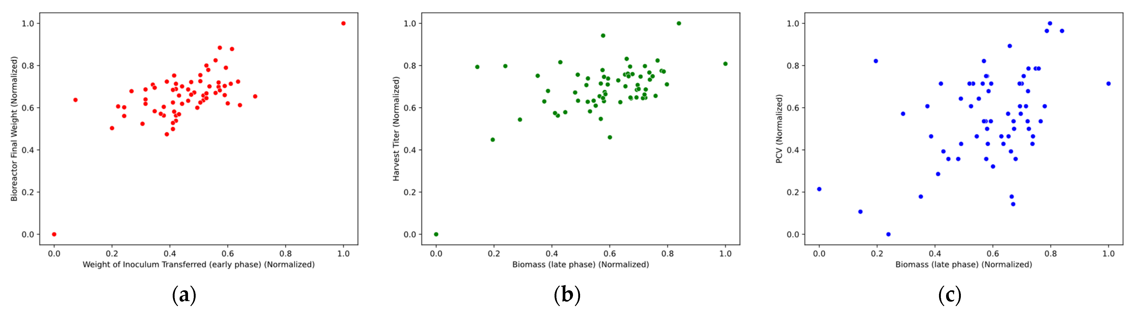 27]. Descriptive statistics were used to summarize the key variables, providing insights into the distribution of CPPs. Correlation matrices were generated to evaluate the relationships between process inputs, monitored variables, and dependent yield indicators. Heatmaps were employed to visualize the correlations between process parameters and harvested yield. Parameters showing negligible or inconsistent correlations with yield outcomes were excluded, while those exhibiting meaningful relationships were retained as candidate features. In addition, scatter plots and histograms were used to analyze parameter distributions across batches, helping identify potential trends or process inconsistencies.
