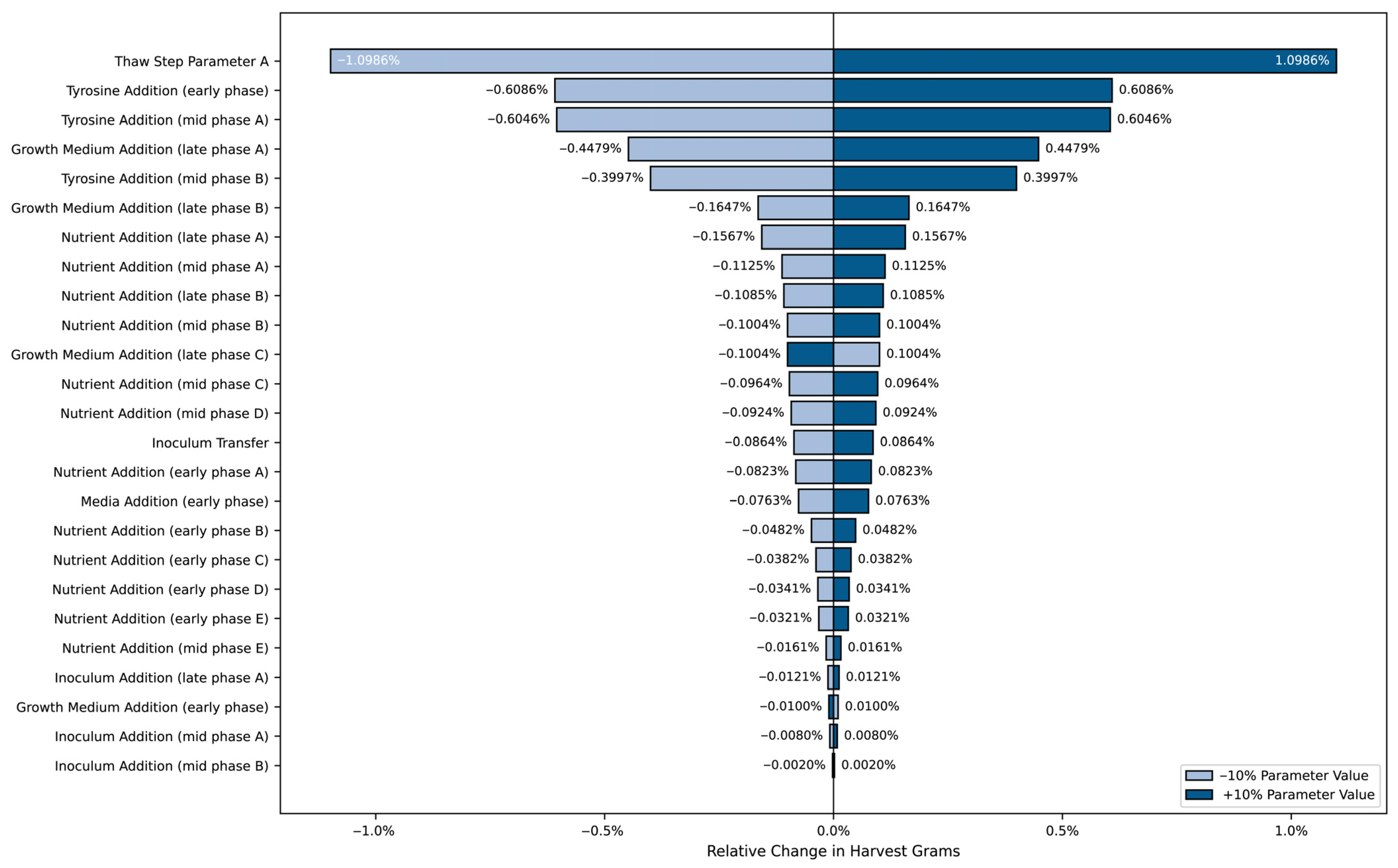 Figure 5, certain parameters strongly affected yield fluctuations. The most impactful parameters were thaw media warming time, tyrosine addition weight at various stages, and nutrient addition volumes. Parameters with the largest bar lengths indicate a greater effect on HG when varied. Notably, an increase or decrease in thaw media warming time and tyrosine addition weight resulted in the highest sensitivity, highlighting the need for precise control to improve production yield.