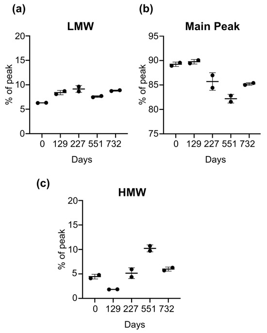 To assess the structural integrity and molecular weight species distribution of released rhBMP-2 from PDLLGA after defined long-term storage intervals, CE-SDS, under denaturing conditions, was employed. This technique enables the precise separation of protein species according to their molecular size. Samples from multiple time points (duplicates) were analyzed to monitor fragmentation, aggregation, or degradation over time. T0 served as the reference, reflecting the initial release sample with initial protein integrity prior to storage-induced changes. The main peak corresponding to intact rhBMP-2 homodimer accounted for 89.240% of the total signal, while LMW and HMW species were present at 6.300% and 4.450%, respectively (Table 1). The results provide insight into the purity, stability, and consistency of RT-stored rhBMP-2 in PDLLGA pellets across defined endpoints (T129, T227, T551, T732 days). Throughout the storage period, slight variations were observed in the main peak as well as in the LMW and HMW species. However, no consistent trend indicating accumulation of either the HMW or LMW species was detected across time points, supporting the overall stability of the protein. The lowest dimer content (82.2%) was detected at T551, which corresponds to the peak in HMW species (10.23%). Both main peak and HMW species returned to their T227 levels at the final storage endpoint, T732. These fluctuations may represent background assay variability, or a slight increase in pH for the sample at T551, which is known to increase rhBMP-2 aggregation [44]. Despite minor shifts, rhBMP-2 remained structurally stable until the study endpoint, T732, with the main peak consistently dominant. The relative distribution of the LMW, main peak, and HMW species across time points is shown in Figure 2, with quantitative values in Table 1.